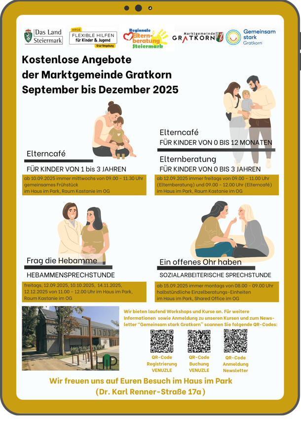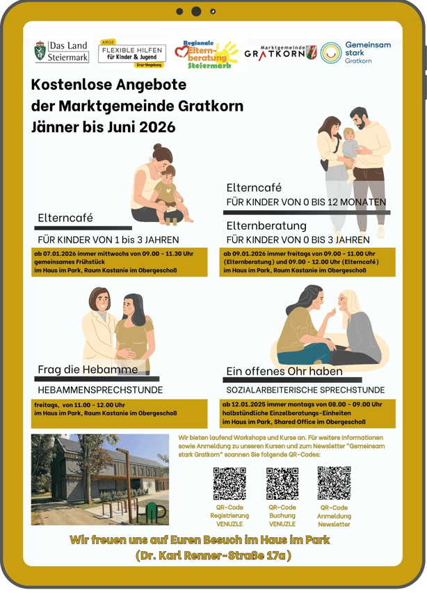 Die Elternberatung, das Elterncafé und die Workshops sind ein gemeinsames Angebot der BH Graz Umgebung, ArGe Flexible Hilfen Graz Umgebung, der ÖGK und der Marktgemeinde Gratkorn.