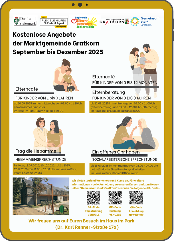 Die Elternberatung, das Elterncafé und die Workshops sind ein gemeinsames Angebot der BH Graz Umgebung, ArGe Flexible Hilfen Graz Umgebung, der ÖGK und der Marktgemeinde Gratkorn.