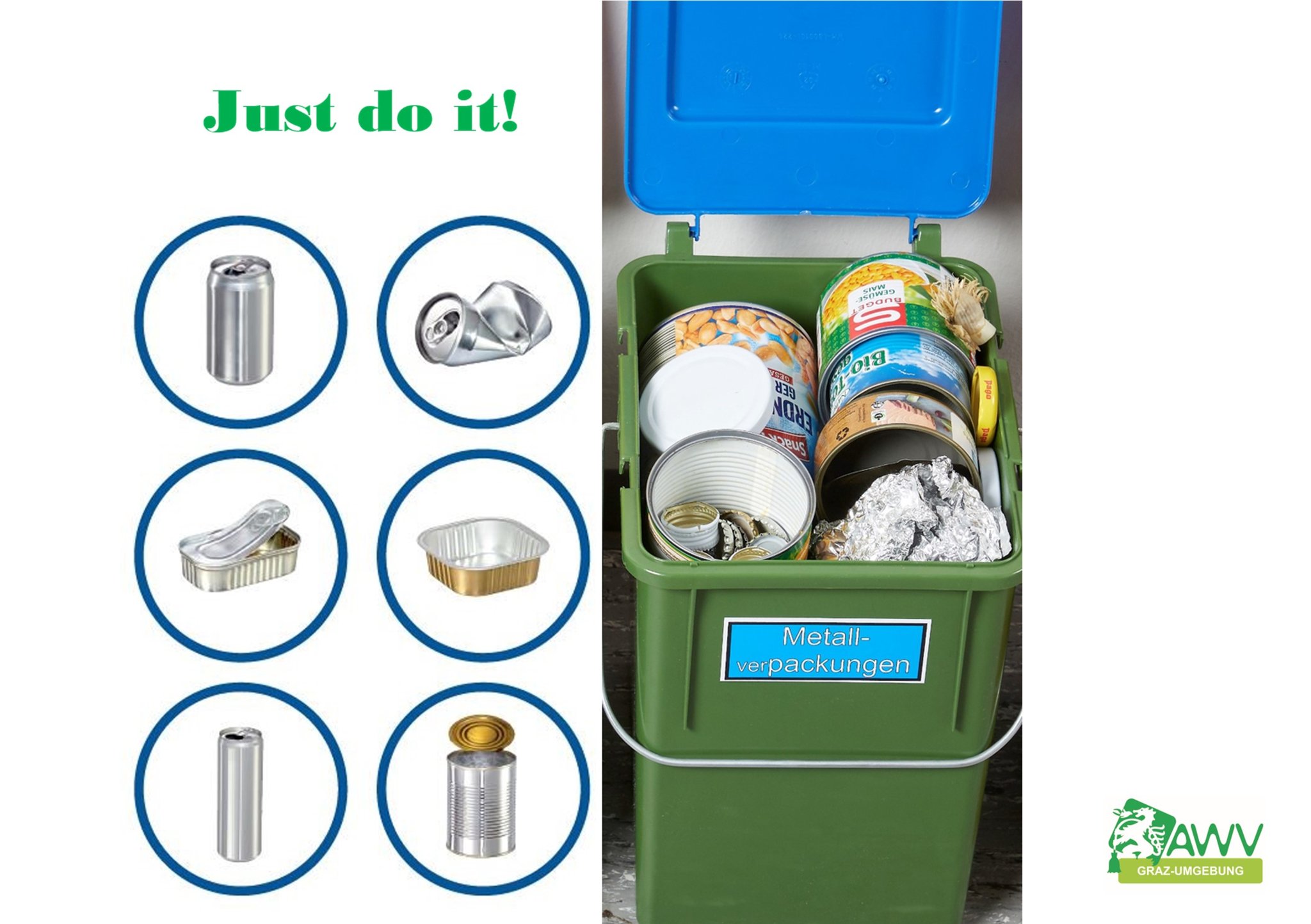 Getränkedosen, Konservendosen, Metalltuben, Schraubverschlüsse, Metalldeckel (z.B.: von Joghurts), LEERE Farb- und Lackdosen, LEERE Spraydosen (Spraydosen mit Restinhalt ins ASZ, sie können explodieren, wenn sie im Müllwagen verdichtet werden).