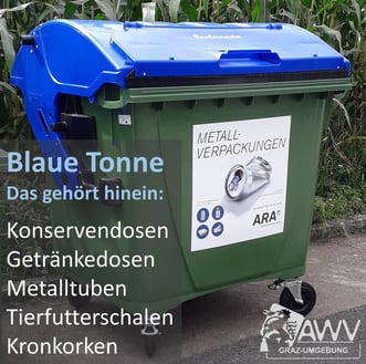 Die in der BLAUEN Tonne gesammelten Metallverpackungen bestehen überwiegend aus Weißblech oder Aluminium. Die Eigenschaften von Stahl (Weißblech) und Aluminium machen diese Materialien zu Recycling-Champions - sie können beliebig oft, ohne Qualitätsverluste, aufbereitet werden! Dafür müssen sie aber zuerst in der BLAUEN Tonne landen. WICHTIG: Verpackungen ausschließlich vollständig entleert in den Behälter einbringen!